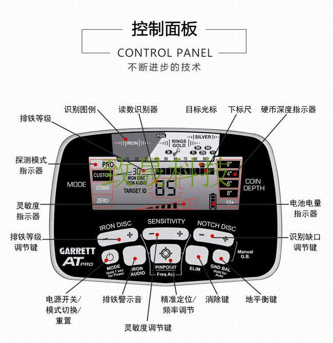 3.IRON AUDIO(鐵金屬音調開關):按下或松開鐵音頻按鈕,開啟或關閉鐵音頻功能。功能啟用時,顯示屏顯示“鐵音頻”字樣。鐵音頻功能可用于AT-PRO的六種模式中的任一種。地下散落的鐵物件會屏蔽一些正確的目標物,甚至產生“鬼鳴”。美國蓋瑞特特有的鐵音頻功能可以讓操作者分辨出鐵的聲音(正常情況下為無聲),從而避免誤挖非想要的目標物。通過鐵識別設定,鐵金屬的音頻也可以調節包括所有目標在內的中音調范圍。操作者可以通過設置關閉低音調的鐵金屬目標和中音調的目標,識別有價值的目標。