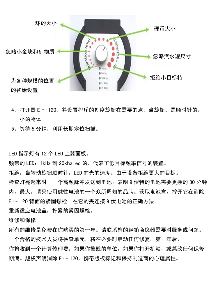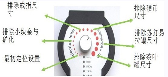 用戶通過使用“抑制電平”旋鈕調整來選擇消除器e-120 B過濾器的干擾抑制速度,以消除礦物質-金塊、硬幣大小、蘇打罐大小或胸部大小的物體。
