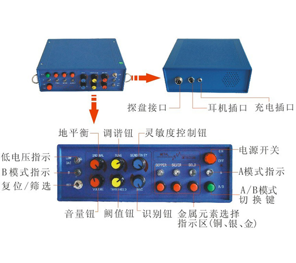 本產品具有A/B兩種工作模式。其中A模式為大范圍搜索模式,B模式為具體確定目標物體的位置模式。按一次A/B切換按鍵。選擇A模式,進行大范圍的搜索。搜索到目標金屬的區域之后再接上探測盤;然后選擇B模式,進行目標物體具體位置的確定。