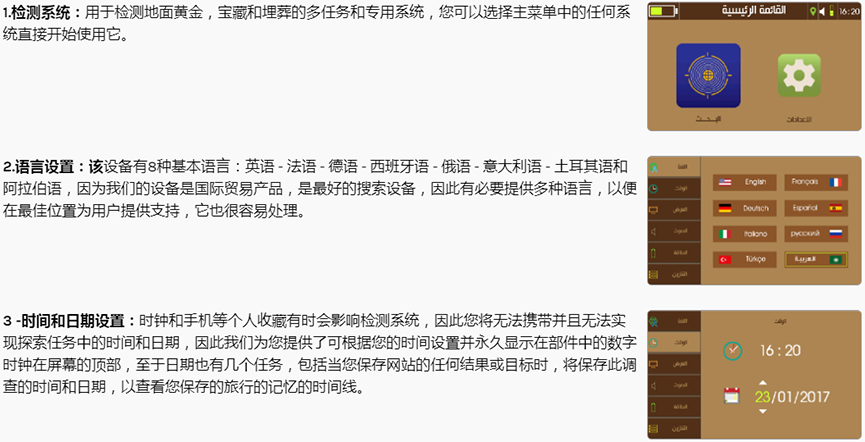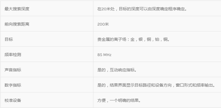 ?該裝置在離子檢測系統上工作,將地下金和埋藏寶物定位到地下深達20米的大深度,前進探測距離可達200米,您可以使用此裝置在車內具有大而快的捕捉目標的能力并定位它們,有可能保存結果供參考。
