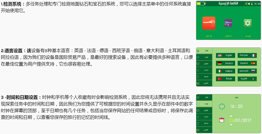 ?Electra設備采用科學系統和先進技術,具有高水平性能,通過使用現代搜索系統檢測地下鉆石和寶石,深度可達100米,為用戶提供全面的搜索界面和準確跟蹤目標的位置和軌跡。