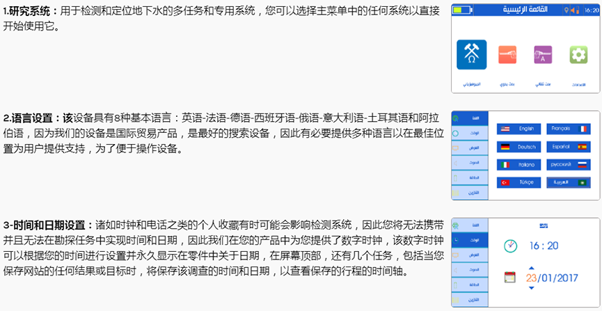 ? 這就是所謂的自動系統,這是世界上初次使用遠程地下水檢測器的情況,我們為您提供了被監測目標的自動檢測系統,以便目標名稱自動出現在屏幕上,并且非常有趣的是確定距支點的目標距離該設備非常精確,可以作為跟蹤和自動檢測的系統,而且用戶在定位目標之后可以自動知道結果在屏幕上出現的深度。