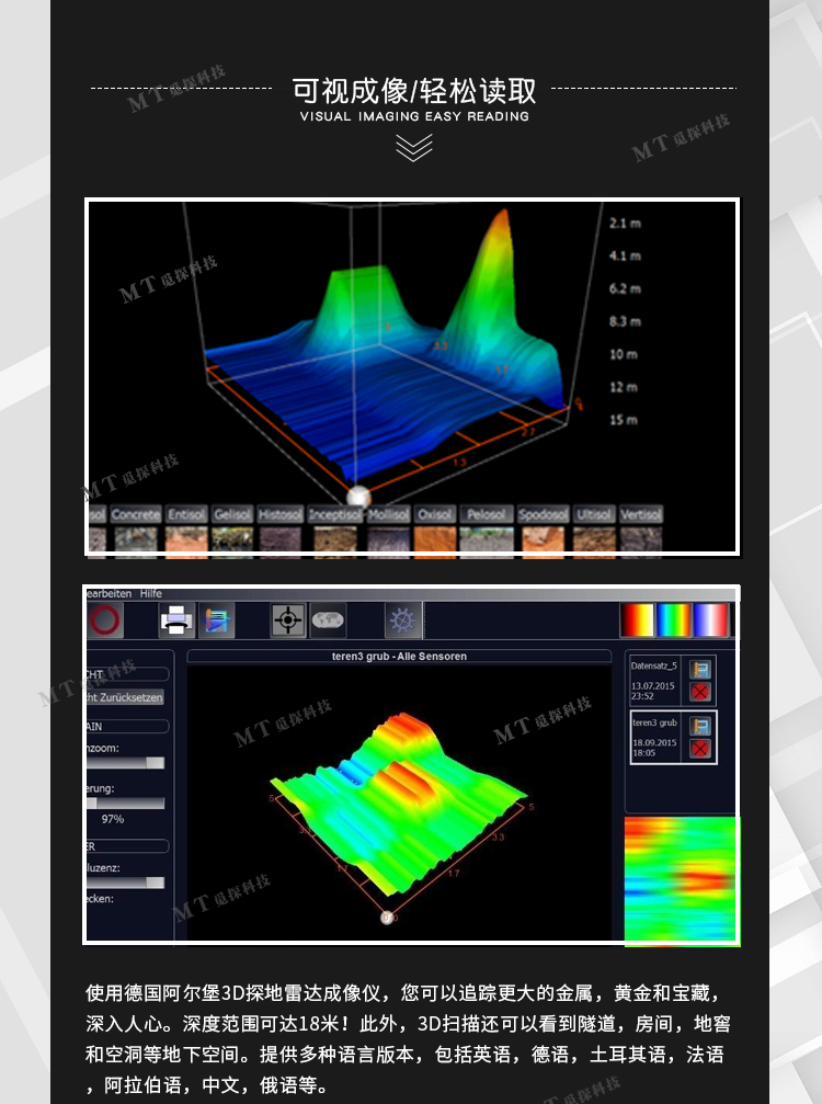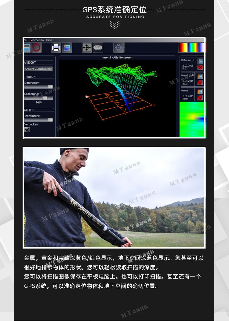 使用德國3D探地成像系統,您可以追蹤大的金屬,黃金和寶藏。深度可達18米。此外,3D掃描還可以看到隧道,房間,地窖和地下空洞等。