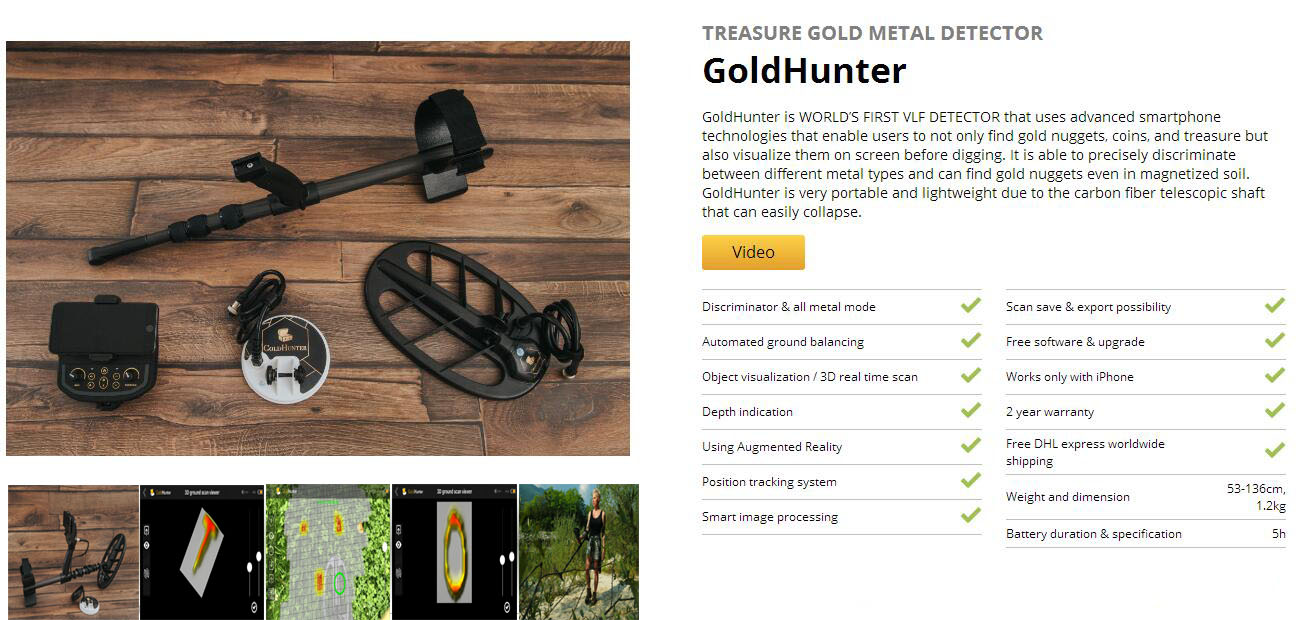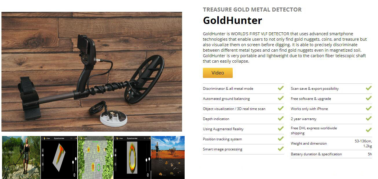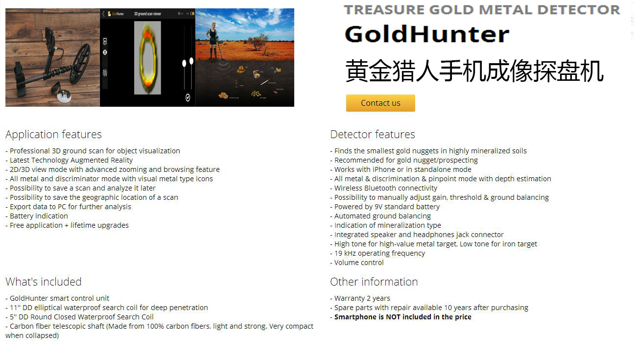 GoldHunter VLF探測器,它使用智能手機技術,可以找到金塊、硬幣和寶藏,還可以在挖掘前在屏幕上看到它們。它能區分不同的金屬類型,甚至在磁化土壤中也能找到金塊。GoldHunter攜帶輕便。GoldHunter金屬探測器,它使用智能手機現實技術實時顯示屏幕上的物體!