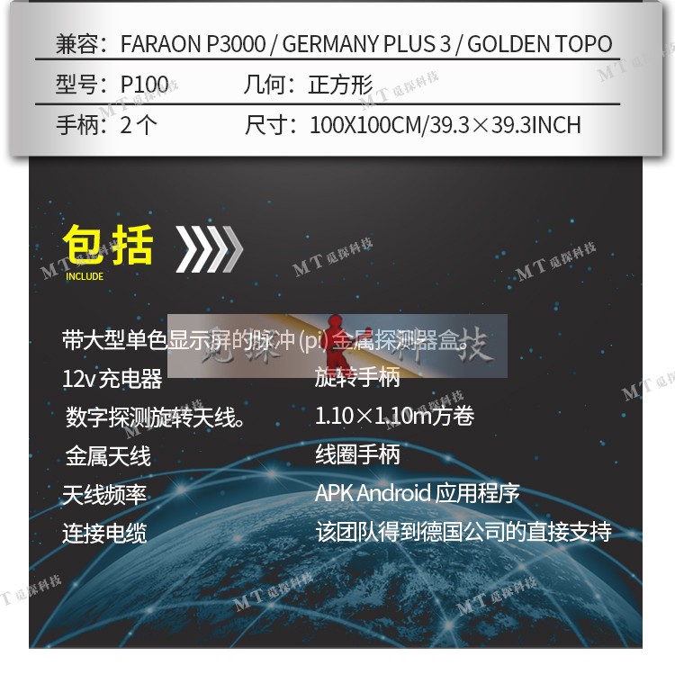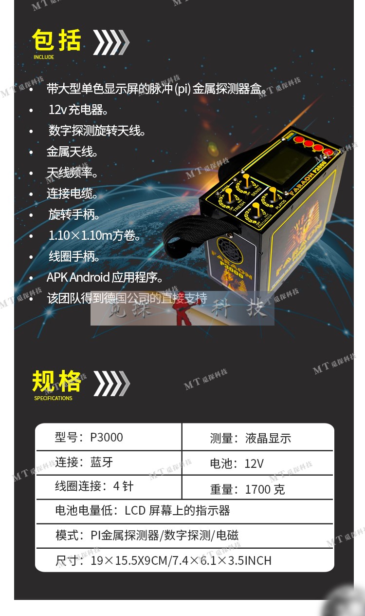 它是一種高科技脈沖感應 (pi) 金屬探測器,頻率為 200mhz 寬度(脈沖 170),包括一個旋轉天線以檢測數字占位和電磁場,該設備是隱藏寶藏搜索的理想選擇,它提供 20 米的功率深度和 1000 米遠的旋轉天線模式。