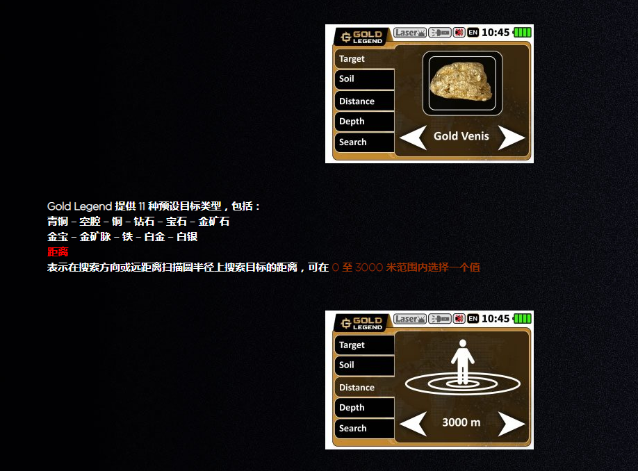 黃金傳奇特點 5 搜索系統 Gold Legend 金屬探測器設備包括五個不同的集成搜索系統,為用戶提供了一種簡單的方法來檢測地下埋藏目標、了解其確切位置并估計其所在深度。 該設備中包含的五個搜索系統包括: 1 – 遠程系統 2 – 自由模式系統 3 – 智能深度系統 4 – 離子系統 5 – 仿生系統 可以從主菜單輕松選擇搜索系統,以下是每個系統的詳細選項。 1 – 遠程系統 遠程搜索系統采用技術開發,可確保遠距離探測深層金屬物體和埋藏寶藏,并提供土壤、目標類型和距離范圍等定制搜索選項,以獲得可靠的正確結果。 Gold Legend中的遠程系統工作原理取決于產生無線電頻率并通過安裝在主機前面的兩個天線發送和發送它們,當設備產生的無線電頻率擊中潛在目標時,設備開始向目標旋轉手柄周圍。