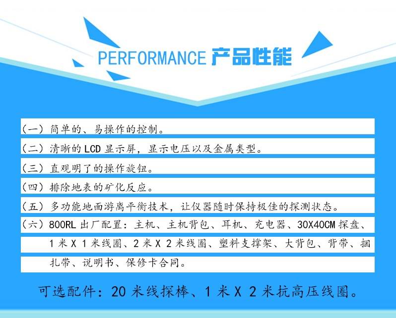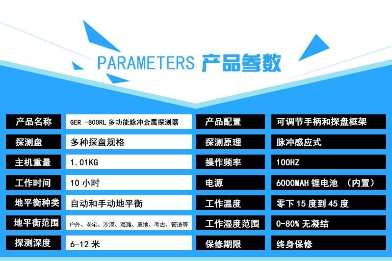 高性能,多用途,內置的微處理器可以使它具有很高的靈敏度和地面平衡控制能力,尤其是在大深度窖藏探測上,在惡劣條件下的遺跡探測,可以通過調節深度旋鈕來控制恰當的靈敏度,排除不必要的干擾;GER-800RL可以選配多種尺寸的探盤,適用于各種不同的復雜環境,100HZ的工作頻率在確保穩定工作的同時可以達到極深的探測深度。